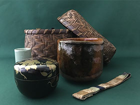 中国煎茶器、朝鮮煎茶器、朝鮮茶器、南蛮茶道具、南蛮古陶磁器、安南茶道具、李朝白磁、高麗青磁、茶掛軸、中国禅僧書画掛軸、日本禅僧書画掛軸、黄檗僧書画掛軸、表千家、裏千家、武者小路千家、久田流、堀内流、小堀遠州流、藪内流、山田宗偏流、速水流、石州流、江戸千家川上不白流、大日本茶道学会など各流派の茶道具、茶器、煎茶器、釜、棚、風炉先屏風、立礼セット、懐石セット、朝鮮風炉釜、茶碗、棗、茶杓、茶入、茶壺、花入、炉縁、香合、茶籠、水指、おけいこ用の茶道具など